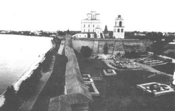 На высоком берегу реки Великой стоит псковский Кремль. На снимке: вид из Довмонтова города. На переднем плане — основание древних храмов Довмонтова города.