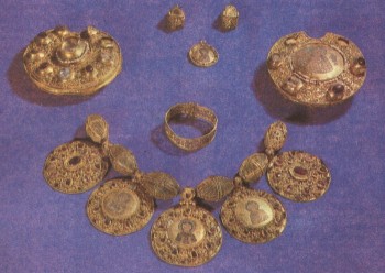 Предметы Старорязанского клада 12 — 15 вв. Золото, скань, зернь, перегородчатая эмаль, самоцветные камни, жемчуг. Музеи Московского Кремля.