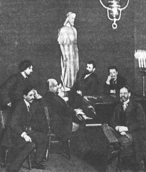 Мамонтовский кружок. В 1880-х гг. дом С. И. Мамонтова в Москве был местом встреч передовых деятелей русской культуры. На снимке: И. Е. Репин, В. И. Суриков, С. И. Мамонтов (за роялем), К. А. Коровин, В. А. Серов, М. М. Антокольский.