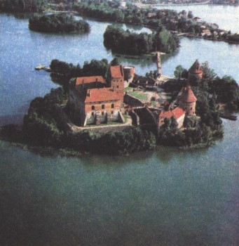 Тракай — резиденция великих князей литовских в 14 — 15 вв. Основан в 1341 г. На снимке: общий вид замка на острове озера Гальве.