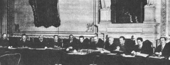 Заседание Временного правительства 1-го состава. В центре — председатель Г. Е. Львов; справа от него — министр юстиции А. Ф. Керенский, слева — министр иностранных дел П. Н. Милюков. Март, 1917 г.