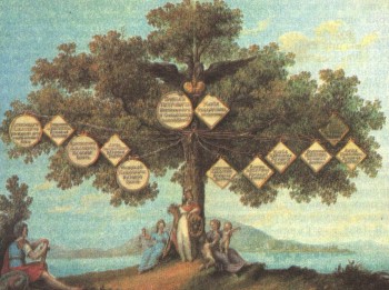 В Европе родственные связи семьи чаще всего изображались графически, в виде родословного древа. В корнях родословного древа помещался родоначальник семьи, а на ветвях в определенной последовательности — его потомки, часто с женами или мужьями. Для оформления такого древа разрабатывалась специальная символика: различной формы щитки, на которых записывались имена мужчин и женщин; такие щитки раскрашивались разными цветами, чтобы указать сыновей и дочерей, их жен и мужей. Уже по форме и цвету изображений можно было определить, принадлежит записанный на щитке человек к данной семье или связан с ней узами брака; есть потомки у этого члена семьи или нет. Генеалогические древа, иногда украшенные гербами и портретами, были очень красочными. В России родословные древа не привились. Лишь в 17 в., когда семьи разрослись, в родословных росписях иногда рисовались маленькие графические схемы, чтобы было проще разобраться в степени родства между отдельными лицами.