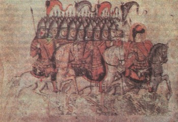 Дружина киевского князя Бориса Владимировича в походе против печенегов. Миниатюра из Сильвестровского сборника житий. 14 в.