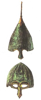 Шлемы древнерусских воинов 12 в. (вверху) и 1-й половины 13 в.