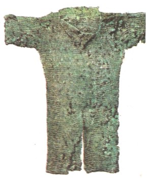 Кольчуга. 12 — 13 вв. Кольчуга представляла собой рубаху с квадратным разрезным воротом. В ней сочетались кольца,склепанные из волоченой проволоки и цельносеченые. Для каждой кольчуги изготовлялось 20 тыс. колец. Кольчуги были двойного и ординарного плетения. Вес кольчуги — от 8 до 17 кг.