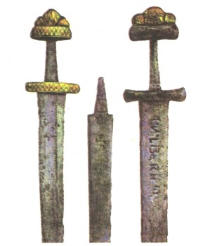 Мечи середины 10 в., найденные в днепровских порогах, на месте гибели князя Святослава и его дружины.