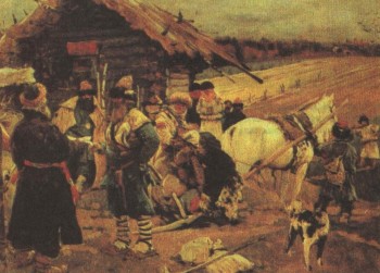 Юрьев день. Картина художника С. В. Иванова. 1900-е гг. Юрьев день (26 ноября по старому стилю) — один из двух церковных праздников в честь Св. Георгия. Судебник 1497 г. разрешал крестьянам переходить от одного феодала к другому за неделю до праздника и неделю после него.