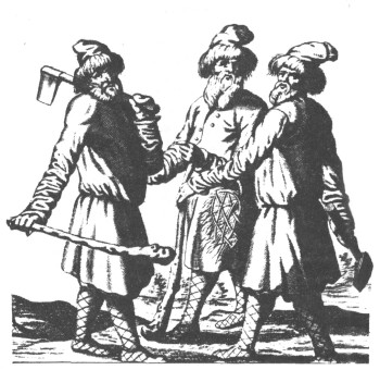 Русские вооруженные крестьяне 18 в. Гравюра А. Олеария.