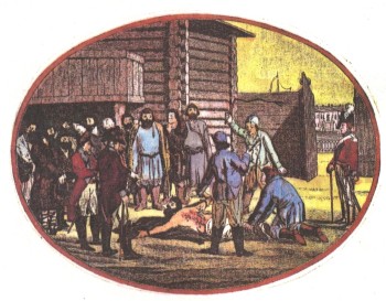 Наказание плетью крепостного крестьянина. Гравюра по рисунку X. Гейслера. 1805.
