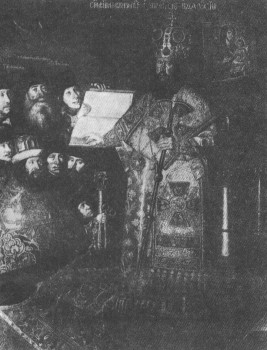 Патриарх Никон с клиром. Картина неизвестного художника. Ок. 1685. Выходец из крестьян, священник, монах Соловецкого монастыря, умный, решительный Никон обратил на себя внимание царя Алексея Михайловича и быстро стал патриархом Московским и всея Руси. Возглавил церковную реформу, приведшую к церковному расколу. Выступал против «сторонников древнего благочестия».