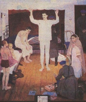 1937 год. Картина художника Д. Д. Жилинского. 1986. Развернувшаяся еще при жизни В. И. Ленина борьба с «врагами народа» приняла впоследствии поистине грандиозный размах, унося жизни миллионов людей. Никто не был застрахован от ночного вторжения представителей власти в свой дом, обысков, допросов, пыток. 1937 год был одним из самых страшных в этой борьбе большевиков против собственного народа. На картине художник изобразил арест собственного отца (в центре картины).