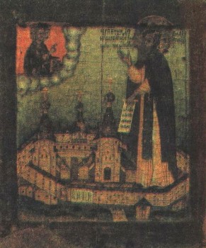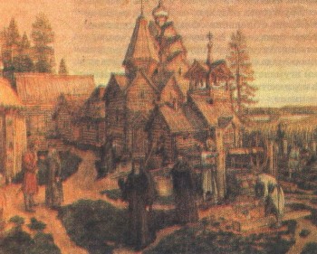 На иконе 17 в. изображен деревянный монастырь. В центре — преподобный Александр Ошевенский.