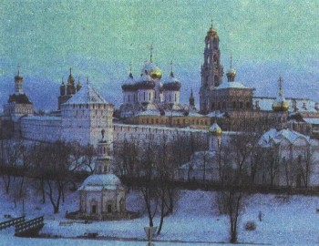 Троице-Сергиева лавра под Москвой была основана в 14 в. Сергием Радонежским. Ее ансамбль включает крепостные стены и башни, Троицкий собор, Духовную церковь-звонницу, Успенский собор, трапезную и др. Здесь действуют Московская духовная академия и духовная семинария.