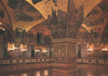 Гравовитая палата. Построена в 1487 — 1491 гг, под руководством итальянских архитекторов Марко Фрязина и Пьетро Антонио Солари. Во второй половине 16 в. Грановитую палату украшали стенные росписи на церковно-исторические темы, почти погибшие при пожаре 17 в. Восстановлены Симоном Ушаковым, Здесь проходили приемы иностранных послов, заседания земских соборов, праздничные пиры. Расположена Грановитая палата на Соборной площади Московского Кремля.
