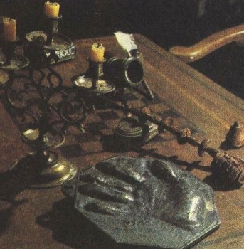Домик Петра I. На снимке: стол в кабинете Петра I. На переднем плане — оттиск руки первого русского императора; рядом — курительная трубка А. Д. Меншикова, сделанная в конце 17 в. в Германии; украшена тончайшей резьбой.