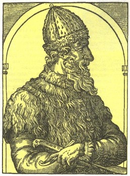 Великий князь московский Иван III Васильевич (1462 — 1505). При нем было свергнуто ордынское иго, сложилось территориальное ядро Русского государства, появился первый кодекс законов. В 1485 г. Иван III принял титул «великого государя всея Руси», гербом государства стал двуглавый орел. Гравюра из «Космографии» А. Теве. 1584.