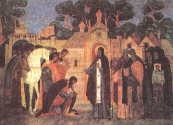 Сергий Радонежский благословляет Дмитрия Донского перед Куликовской битвой. Роспись Троице-Сергиевой лавры. Преподобный Сергий Радонежский (ок. 1321 — 1391), которого русская православная церковь причислила к лику святых, выступал за объединение всех русских земель, не раз мирил князей в их несогласии. Во время Куликовской битвы он молился у себя в церкви, а в конце сказал: «Мы победили».