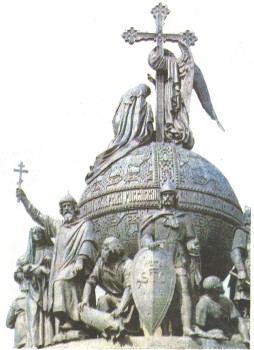 Памятник «Тысячелетие России» в Новгороде. Скульптор М. О. Микешин. 1862. Памятник сооружен в ознаменование тысячелетия со времени призвания Рюрика новгородцами. Верхняя часть монумента в виде шара символизирует державу — эмблему царской власти. Коленопреклоненная женщина на шаре олицетворяет Россию. Ее осеняет крестом ангел. В скульптурах, опоясывающих сооружение, мы видим великих князей, царей, императоров, выдающихся полководцев и флотоводцев, поэтов и писателей, сыгравших заметную роль в истории России. Всего было отлито 129 фигур.
