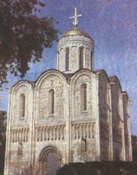 Дмитриевский собор во Владимире — замечательный памятник архитектуры конца 12 в. Вся верхняя часть его наружных белокаменных стен сплошь покрыта резными украшениями. Здесь можно увидеть царя Давида, Александра Македонского, возносимого на небо грифонами, охотников, фантастических зверей и птиц среди диковинных трав и пышных цветов. Каждое изображение располагается на отдельном камне, составляя вместе подобие узорчатой ткани, словно наброшенной поверх каменного массива храма.
