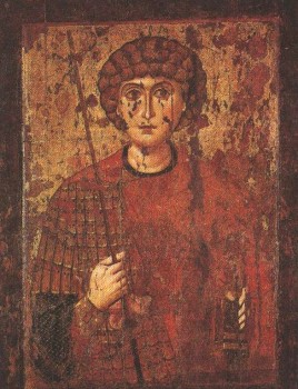Св. Георгий. Икона новгородского письма. Ок. 1174. На ней Св. Георгий выступает в образе храброго и стойкого воина, покровителя ратных людей. В правой руке он держит копье, в левой — меч, являвшийся на Руси своеобразной военной эмблемой и символом власти, в частности княжеской. По-видимому, икона была заказана младшим сыном Андрея Боголюбского — князем Георгием Андреевичем и Св. Георгий выступает здесь как патрон князя, а меч в его руке служит знаком княжеского достоинства охраняемого им лица. Св. Георгия считал своим патроном и князь Юрий Долгорукий.