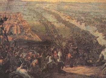 Полтавская баталия 27 июня 1709 г. Второй этап. На гравюре изображено столкновение основных сил русской и шведской армий. Вдали (слева) — очертания Полтавской крепости. Ее четырехтысячный гарнизон при поддержке местных жителей в течение почти трех месяцев выдерживал осаду 30-тысячной армии Карла XII. На переднем плане (на холме) — Петр I; за ним — его сподвижники. Вдали видны редуты, позволившие коннице и небольшой части пехоты смешать боевой порядок врага и разгромить отряды Росса и Шлиппенбаха, сохранив основные силы русской армии, находившейся в укрепленном лагере. Сражение под Полтавой закончилось блестящей победой русских.