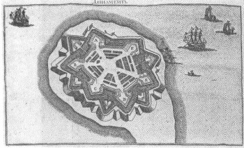 План крепости Динамюнде. Взята русскими войсками 9 августа 1710 г. Гравюра неизвестного художника из «Книги Марсовой». 1766.