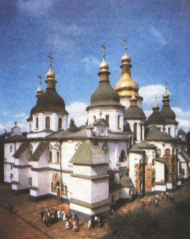 Этот шедевр древнерусской архитектуры был построен в центре Киева в 1037 — 1046 гг. София Киевская поражает своим величием, совершенством композиции и архитектурных форм, замечательным внутренним оформлением. Среди фресок собора особый интерес представляют изображения членов семьи его основателя — Ярослава Мудрого (сейчас сохранились только изображения дочерей и младших сыновей). В соборе совершались торжественные церемонии, как религиозные, так и гражданские (вступление князей на великокняжеский престол).