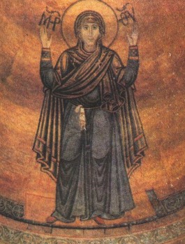 Фигура Богоматери — Оранты выложена из кусочков разноцветных камней, керамики и смальты. Мозаика 11 в.