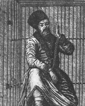 Яицкий казак Бмельян Пугачев, пойманный в 1774 г., привезен был в Москву в деревянной клетке и посажен на Монетном дворе... Пугачев сидел прикованный к стене за железной решеткой и показывался народу в продолжение двух месяцев до дня казни» — так было написано на доске около клетки и кандалов Пугачева. Старинная гравюра.