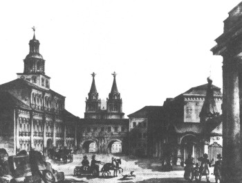 Слева — здание, в котором в 1755 г. был открыт первый в России Московский университет. 8 августа 1754 г. вышло распоряжение правительства, в котором говорилось: «Для учреждения вновь в Москве Университета дом, стоящий у Куретных ворот... починкою исправить и в состояние привести». Перестройкой дома и его отделкой руководил известный архитектор Д. В. Ухтомский. Здание выбирал М. В. Ломоносов — инициатор создания университета.