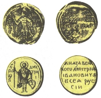 Серебряная позолоченная булла великого князя Дмитрия Ивановича Донского (лицевая и оборотная стороны). Булла — металлическая печать, скрепляющая документ.