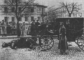 Карета казначейства с убитой лошадью после нападения боевиков-эсеров на Екатерининском канале в Санкт-Петербурге. Бросив несколько бомб в сопровождающий конвой и под лошадей, террористы похитили мешки с ценностями.