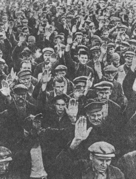 Расстрелять убийц — таков приговор народа! Рабочие Ленинградского машиностроительного завода подземных сооружений, жестоко обманутые тоталитарной системой и большевистской пропагандой, превращенные в послушную толпу, не способную противостоять злу, одобряют приговор по так называемому троцкистско-зиновьевскому блоку. Снимок 1936 г.