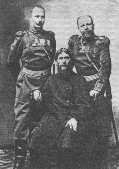 Григорий Ефимович Распутин (Новых, 1872 — 1916) — крестьянин тобольской деревни. Оказывая помощь больному гемофилией наследнику престола цесаревичу Алексею, приобрел неограниченное доверие императорской семьи. Убит заговорщиками в 1916 г., считавшими влияние Распутина гибельным для монархии. На фотографии— в центре. 1910-е гг.