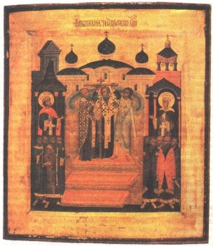 Воздвижение креста. Икона 19 в. По евангельскому преданию, в 6 в. при византийском императоре Константине и его матери царице Елене были предприняты поиски, а затем и испытания креста, на котором был распят Иисус Христос. Найденный крест торжественно установили в Константинополе.